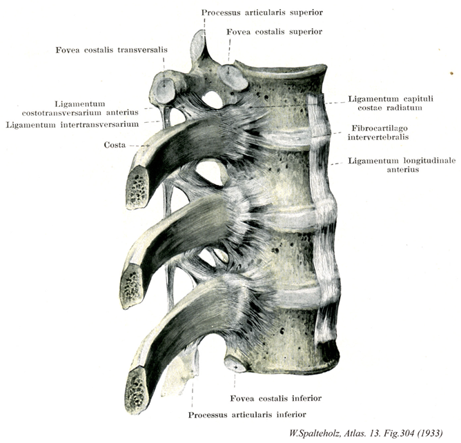 - 304_07【Radiate ligament of head of rib放射状肋骨頭靱帯 Ligamentum capitis costae radiatum】 Ligament that reinforces the anterior surface of the joint capsule. It radiates from the rib in a stellate fashion over the head of the rib to the two adjacent vertebral bodies and the intervertebral disc between them.
