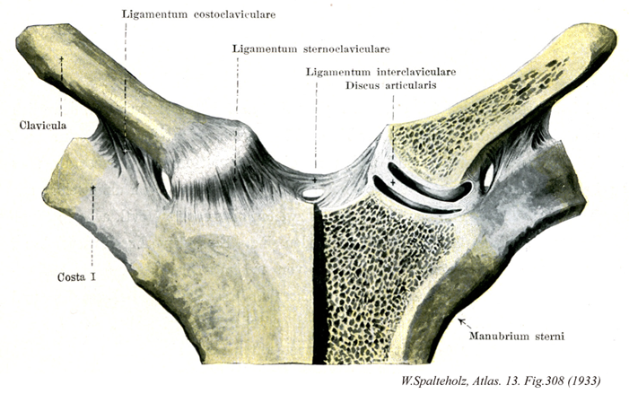 →(胸鎖関節は鎖骨の胸骨端と胸骨の鎖骨切痕との間の関節で、鎖骨の胸骨端が大きいために、関節面は第1肋軟骨の内側端上縁にまでおよんでいる。また、鎖骨胸骨端の上部は胸骨上縁より上方やや後方に突出する。胸骨と鎖骨の関節面の形は個人差が大きいが、一般的にいずれも浅い鞍状である。胸骨の鎖骨切痕と鎖骨の胸骨端はあまりよく適合しないが、線維軟骨性の関節円板(後上方の部が最も厚い)が介在して両者を適合せしめ、かつ関節腔を完全に2分する。)
