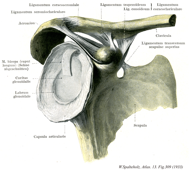→(上腕骨頭は球の約3分の1にあたるが、卵円形の関節窩は小さく、関節頭としての上腕骨頭の関節面の約3分の1の広さにすぎない。関節窩の周縁は、線維軟骨性の関節唇によって補われる。)