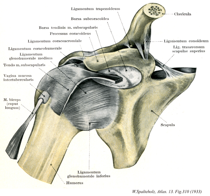 →(肩関節は肩甲骨関節窩と上腕骨頭との間の典型的な球関節。関節窩は小さく、関節頭としての上腕骨頭の関節面の約1/3の広さにすぎない。関節窩の周縁は、線維軟骨性の関節唇によって補われる。関節包の外側にはこれを補強するとくに強い靱帯がないから、両者の結合はゆるく、関節の自由な運動を可能にする。補強靱帯の代わりをするのは、肩甲骨から起始して上腕骨近位部に停止する肩甲筋群である。関節包は、上方には関節窩の周縁につき、ここで関節唇の外側と癒着し、下方には上腕骨の解剖頚につく。また内側は関節の下方でゆるみがあるから、これが上肢の回転を可能にするが、同時に下方への脱臼をおこしやすい原因となる。関節腔内は上腕二頭筋長頭の腱によって貫かれる。この腱は下方から上腕骨の結節間溝を通って関節腔に入り、上腕骨頭の前面を通って肩甲骨の関節上結節につく。全身の関節のうち最も大きい運動範囲をもち、その運動は屈曲(前方挙上)、伸展(後方挙上)、内転、外転、描円および回旋に分析鎖される。これらの運動は上肢帯の関節(胸鎖関節と肩鎖関節)との共同運動により範囲が増大される。肩甲骨関節窩は、前頭面(左右方向)に向いているのではなく、これより前外方に約30°の角をなす面にあるから(この面を肩甲骨面という)、肩関節の運動もこの面において最も運動範囲が広い。日常、物を書くときや、箸を取るときの上腕骨の位置にもこの面にある。これに属する靱帯として次のものがある。関節上腕靱帯は、関節唇の上前縁よりおこり解剖頚へつく。烏口上腕靱帯は、烏口突起の外側面よりおこり、上腕骨結節間溝の近位端にのび、ここで上腕二頭筋長頭の腱をおおう。 )