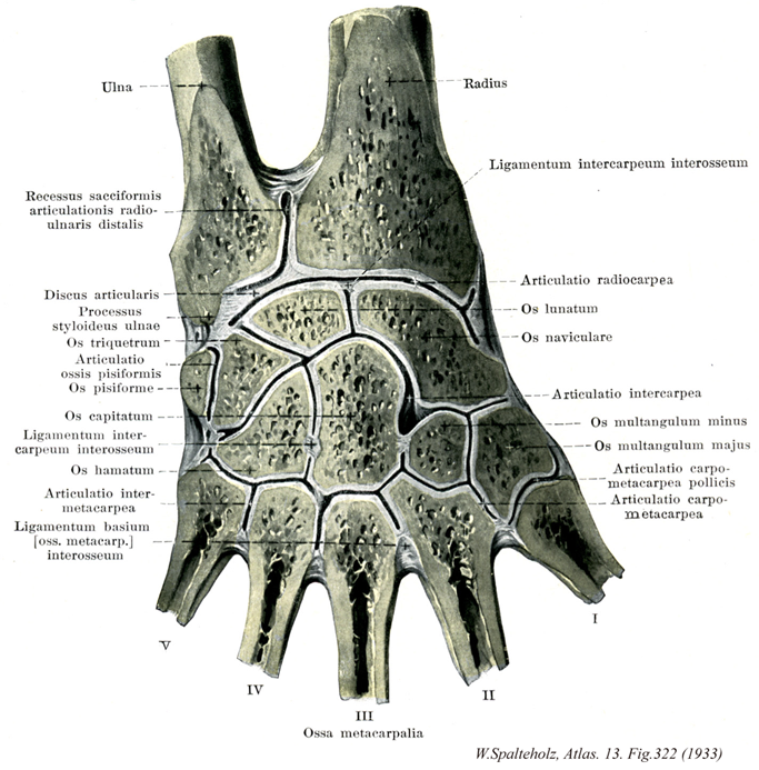 322_22【Carpal joints; Intercarpal joints手根関節;手根間関節;遠位手関節 Articulationes carpi; Articulationes intercarpales】 The joints between the carpal bones. →(すべての手根骨の相互間の関節を総称していう。したがって、このなかに豆状骨関節、手根中央関節と同義語に用いられることもある。)
