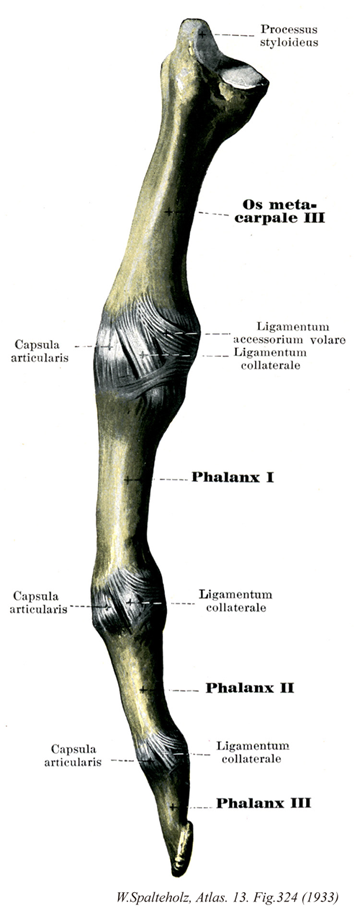 324_08【Collateral ligaments of interphalangeal joints of hand側副靱帯(指節間関節の) Ligamenta collateralia articulationis interphalangeae manus】 Collateral ligaments of the phalangeal joints. →(側副靱帯は近位の篩節骨頭の指筋骨頭の側面にあるくぼみから遠位の指節骨底に至る線維束で、指節の屈指運動の支点となる。側副靱帯は中手骨頭から基節骨に向かって扇状に広がり、指を伸ばす時はゆるみ、指を曲げる時には緊張する。このため、屈曲時には内・外転は阻止される。たとえば挙を握る時には、指を外転、すなわち側方にひろげることはできない。)