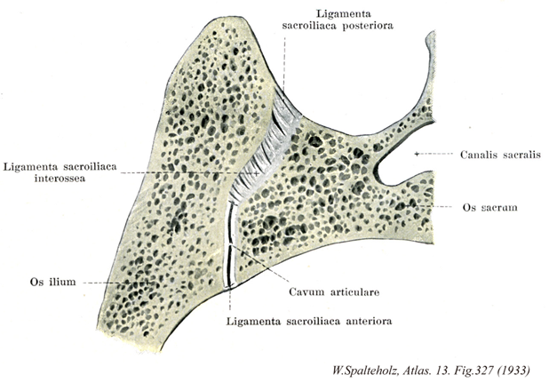 →(仙腸関節は仙骨の耳状面と腸骨の耳状面によってつくられる関節で、両関節面は軟骨をかぶり、両者の間に滑液を含んだせまい関節腔が存在する。関節面は凸凹があり、また関節包強い靱帯によって包まれるから可動性はほとんどない。仙骨と腸骨の耳状面は著しく不平胆であるが、この面を関節軟骨が被った状態では極端な凹凸はなく、従って、運動制止の主要因にはならないと思われる。また、概括的には、仙骨耳状面の上2/3は縦軸方向に溝状に凹み、寛骨耳状面はそれに対応した隆起をして両者が咬み合う。関節軟骨の深層は硝子軟骨であるが、その表層は線維軟骨性である。年令が進むと、特に弾性では、関節腔が部分的に消失するという。付属する靱帯に次のものがある。(1)前仙腸靱帯:関節包の前面にあって仙骨外側部の前面と腸骨の耳状面の辺縁につく。(2)骨間仙腸靱帯:関節包の後方で、腸骨の腸骨粗面と仙骨の仙骨粗面とを結ぶ強い短い靱帯で、仙骨と腸骨の間隙を埋めている。(3)後仙腸靱帯:前者の表層にあって腸骨と仙骨の後面を結ぶ。上部の線維束は、ほぼ水平に横走して仙骨粗面と外側仙骨稜から腸骨粗面へ走り、下部の線維は斜め上外方へ箸って、外側仙骨稜と上後仙骨棘へ達する。)