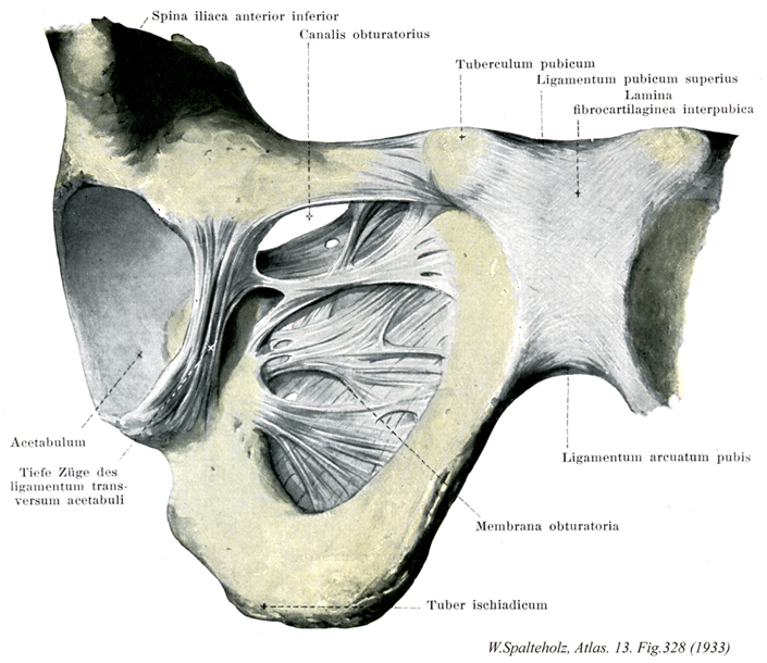 - 328_09【Obturator membrane閉鎖膜 Membrana obturatoria】 Membrane that closes the obturator foramen except for a superomedial opening that forms a portion of the obturator canal. Origin of the obturator intemus and externus muscles.