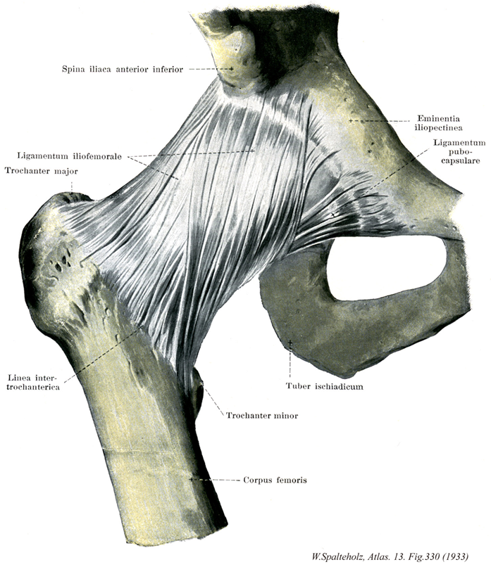 →(腸骨大腿靱帯は下前腸骨棘および寛骨臼上縁から起こり、拡がって転子間線に至る三角形の強い靱帯で、関節包の前面と上面を補強する。しかし転子間線に近い中央部はやや弱いので、強い線維束となる部は逆Y字形となる。特にその外上部は、上方では下前腸骨棘に着く大腿直筋腱の線維、下方では大転子に着く小臀筋腱の線維が表面から加わり、股関節包靱帯のなかでも最大の部分となる。腸骨大腿靱帯は靱帯最大の靱帯で、上半身が股関節より後へ傾くのを防ぐバンドの役目をしている。つまり直立のバランスをとるためには、腸腰筋と共に不可欠のものである。なお上半身が股関節で前へ傾くのを防ぐものとしては、大腿筋が最も重要である。腸骨大腿靱帯の三角筋は両側辺が厚くて中央部が薄いので、英仏ではV字靱帯、またはY字靱帯Y-shaped ligamentと呼んでいる。)