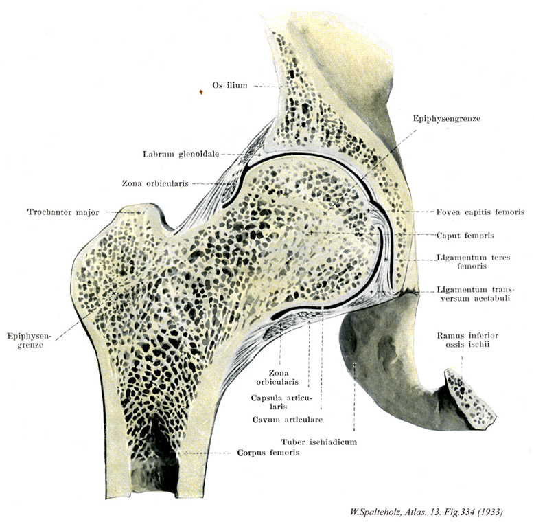 →(寛骨臼の縁には線維軟骨性の関節唇が着いて関節窩を深くするとともに、関節唇の遊離縁はややせばまっているので、大腿骨頭を包み込むような形を取る。)