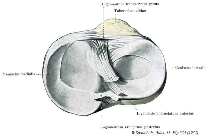 →(内側半月は半月状で内側側副靱帯と癒着している。その付着部は比較的たがいに離れている。この半月は前よりも後の方が広い。つまり、前脚は後脚よりも狭い。内側半月はその付着状態によって外側半月よりもはるかに可動性が少ない。下腿の外旋のさい、内側半月はもっとも強くずれ動き、無理にひっぱられる。しかし内旋時にはこの半月は負荷を免れる。)