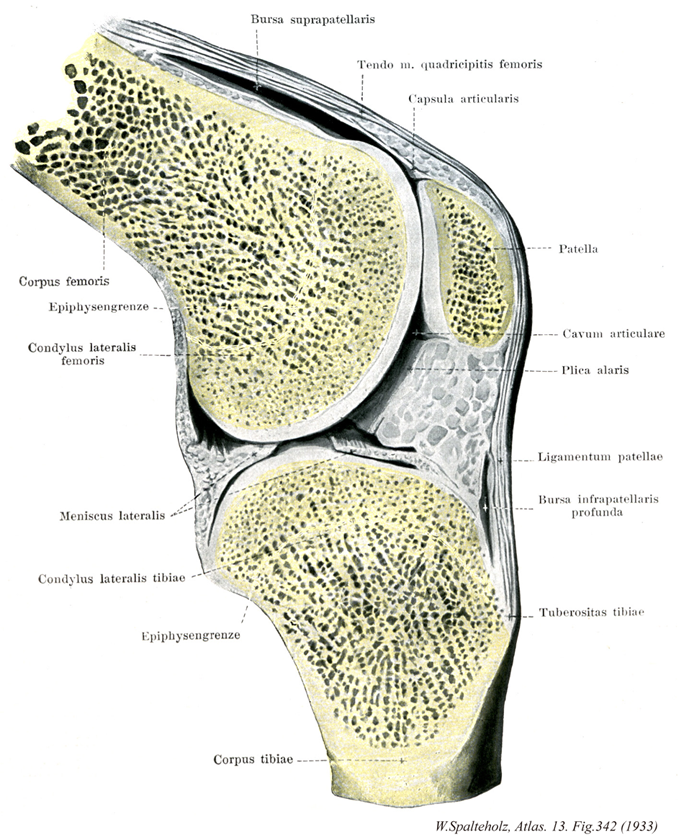→(膝関節は大腿骨下端の内側顆および外側顆と、脛骨上面の同名部分との間の関節で、これに関節包の前壁にある膝蓋骨が構成に加わる。腓骨は関与しない。脛骨上面の関節面には、内側顆と外側顆の表面に線維軟骨の関節円板があって、大腿骨下端の関節面に対する。関節円板は周辺が厚く、中心部は薄いから、断面ではクサビ形を呈している。内側半月は半円形であるが、外側半月はほぼ完全な円形で内側半月に比べて小さい。膝関節は屈伸運動のみを行う蝶番関節とみなさえるが、膝を曲げた状態では下腿の内旋(10°)、外施(40°)が可能である。また膝を十分に伸ばすとき、その最終段階では下腿のわずかな外施(5°)がみられ(これを終末回旋という)、この状態から再び膝をまげるときには、その最初の段階として下腿の内旋がおこなわれる。この意味で純粋な蝶番関節ではない。直立位(膝を伸ばした状態)では、大腿骨の内側顆と外側顆は、それぞれ下面の比較的平面的な部分で広く脛骨に接するが、膝をまげたときには、大腿骨の内側顆、外側顆の後面にある弯曲の強い局面によって脛骨に接する。膝蓋骨の関節面は、この屈伸に際して大腿骨下端の前面にある膝蓋面を上下に移動する。関節内には、膝蓋骨の下端から大腿骨の顆間窩に向かって滑膜のヒダが前後に走り、これを膝蓋下滑膜ヒダという。このヒダから内外両側に向かって内部に脂肪組織(膝蓋下脂肪体という)を含んだ滑膜のヒダがのびて関節腔のすきまをみたしている。これを翼状ヒダという。関節の付属靱帯として次のものがある。(1)膝十字靱帯:関節腔内のほぼ中央でX字状に交差する二つの強力な靱帯で、脛骨に対する付着部の位置的関係によってそれぞれ前十字靱帯、後十字靱帯という。前者は脛骨の前顆間区anterior intercodylar areaに付着し、膝関節腔内を上後外側方に走り、大腿骨の外側顆内面後部に付着する。この靱帯は膝関節屈曲時にゆるみ、膝関節完全伸展時に緊張する。前十字靱帯は、脛骨上で大腿骨が後方に偏位するのを防ぐ。膝関節屈曲時における前十字靱帯は、脛骨上端が前に倒れようとするのを妨げる。後者は脛骨の後顆管区posterior intercondylar areaに付着し、膝関節腔内を上前内側方に走り、大腿骨の内側顆外側面前部に付着する。この靱帯の前線維はは、膝関節伸展時にゆるみ、膝関節屈曲時に緊張する。また、この靱帯の後線維は膝関節伸展時にゆるみ、膝関節屈曲時に緊張する。後十字靱帯は、脛骨上で大腿骨が前方に変異するのを防ぐ。膝関節時における後十字靱帯は、脛骨上端が後ろに倒れようとするのを妨げる。(2)前半月大腿靱帯・後半月大腿靱帯:外側半月の脛骨上面における後端部から出て上外方に走り、後十字靱帯のすぐ後方で大腿骨内側顆の外面につく強い線維束が後半月大腿靱帯で一名Wrisbergの靱帯という。一方、同じく外側半月の後端部から出て前方に走り、前十字靱帯の外側部につく弱い線維束を前半月大腿靱帯という。これは欠如することがしばしばある。(3)膝横靱帯:強さに個体差が大きい。両関節半月の前面を結んで脛骨上面の前端部を横走する。(4)斜膝窩靱帯:半膜様筋の停止腱からつづいて関節包の後面を上外方へ走り、大腿骨外側顆の後面の付近へ放散する。(5)弓状膝窩靱帯:脛骨頭よりおこり、関節包の後面を上内方へ向かって膝窩筋の起始部の表層をおおう。明瞭でないこともある。(6)外側側副靱帯:強い棒状の線維束で、大腿骨の外側顆よりおこり、関節包の外側を下方に走って腓骨頭へつく。この靱帯と関節包との間にはせまい隙間があって、ここを外側下膝動脈が通る。(7)内側側副靱帯:内側半月の表層に接して関節包を補強する幅の広い薄い靱帯で、大腿骨内側顆と脛骨の内側顆を結ぶ。外側側副靱帯とともに蝶番関節に特徴的な縦走靱帯であるが、膝を伸ばした状態では緊張して関節の小手に役立ち、膝をまげた状態では弛緩して、下腿の回旋を可能にする。(8)膝蓋靱帯:本体は大腿四頭筋の停止腱ともみなすべきもので、膝蓋骨の下端から脛骨粗面にのびる。強い扁平な靱帯で長さ約8cm、幅は膝蓋骨下端の起始部で約3cmで、膝関節方の前面下部を補強する。表層の線維は膝蓋骨の前面をこえて大腿四頭筋の腱からつづく。(9)内側膝蓋靱帯・外側膝蓋支帯:大腿四頭筋停止腱のうち、膝蓋骨を介して膝蓋靱帯となる中央の部分を除いてその両側の部分をいう。これは膝蓋骨の両側を通って下方にのび、脛骨粗面の両側で脛骨上端部につく。内外両側から膝蓋骨を支えて、屈伸運動にあたって膝蓋骨の左右への動揺を防ぐ。)