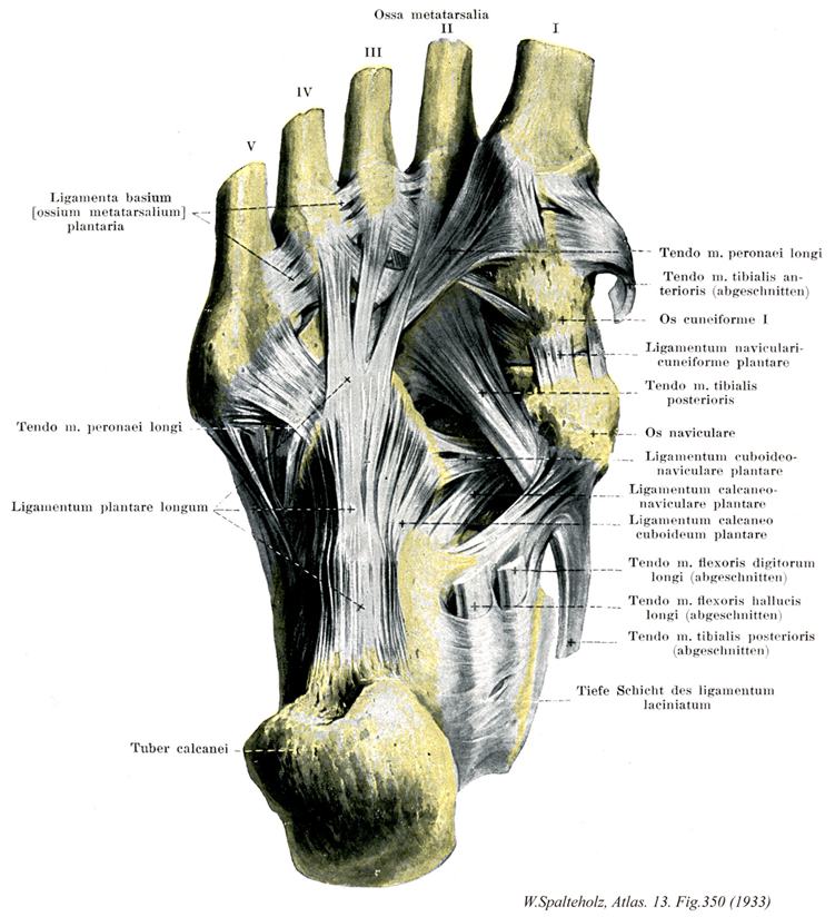 →(長足底靱帯は足底の靱帯のうち最も表層にありまた最も長い。そのほかの底側足根靱帯はこれにより下方から被われ、その間に粗な結合組織が介在する。距骨隆起の下面から起こって前方に広がり、その深層の線維は立方骨の長腓骨筋腱溝の後の立方骨粗面に着く。浅層の線維は同腱の表面を越えて少なくも3束に分かれて中足骨底に着く。)