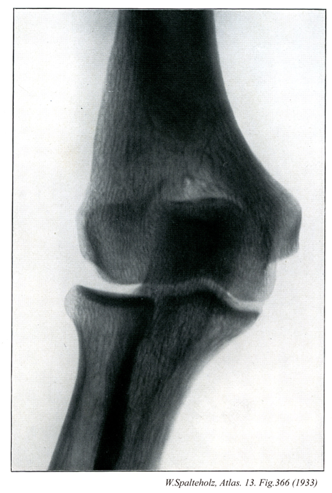 →(肘関節は上腕骨と橈骨、尺骨の3骨の間に生じた複関節で、肘の屈伸を行う。したがって分類状は1軸性の蝶番関節とみることができる。上腕骨滑車と尺骨の滑車切痕との間の腕尺関節、上腕骨小頭と橈骨頭との間の腕橈切痕との間の上頭尺関節が共通の関節包におおわれる。しかし後者は機能的には下橈尺関節とともに前腕の回旋に関係するので、前2者とは別に記載するのが通例である。上腕骨の内側および外側上顆は関節包におおわれない。関節包の内側と外側はそれぞれ内側側副靱帯および外側側副靱帯によって補強される。橈骨輪状靱帯は、関節包の内面が肥厚した幅約1cmの靱帯で、尺骨の橈骨切痕の前縁からおこり、橈骨の関節環状面を輪状にとりまいたのち、再び尺骨の橈骨切痕の後縁につく。この靱帯の関節腔に面した部分は軟骨性となり、尺骨の橈骨切痕とともに上橈尺関節における関節窩を形成する。肘関節における屈伸運動の役割を演ずるのは腕尺関節である。しかし上腕骨滑車の内側部の直径が外側部のそれよりやや大きいため、肘を伸ばすと、その時の尺骨の長軸は、上腕骨長軸よりも外方へ約10~20°の傾きを示す。この角をcarrying angleという。しかし肘を曲げたときは、両骨の長軸は重なり合う。)