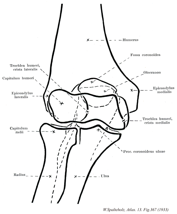 →(上腕骨の下端部では、まず内側方に内側上顆が、外側方に外側上顆が突出している。内側上顆は指先でつまめるほどのおおきな突出であるが、外側上顆の突出は軽度である。)