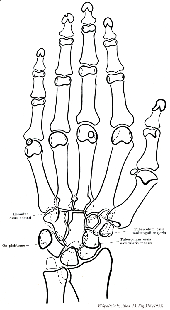 →(手は上肢のうち橈骨手根関節より遠位の部分。手根と中手に区別され、手根と中手の前面を手掌、後面を手背という。皮膚節において第六頚神経、第七頚神経、第八頚神経のレベル。)