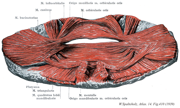 →(口輪筋の線維は部分的には、口角の外側粘膜にほとんど垂直方向に固定されている結合組織帯から起始し、一部は、口角へ向かって収斂し、かつその部で“筋結節”(硬結塊)を形成する隣接顔面筋(特に頬筋)の線維束から、細かい介在腱を介して起始する。上および下唇の中央部においては筋線維はかみ合って、一部は正中面を乗り越えて広がり、縦方向線維のマットを形成する。表層束は皮膚へ入る。参考:Origo nasalisは鼻中隔部の皮膚から起こり、これも鼻中隔下制筋とよばれることがある。上に述べた同名筋より浅い層にある。)