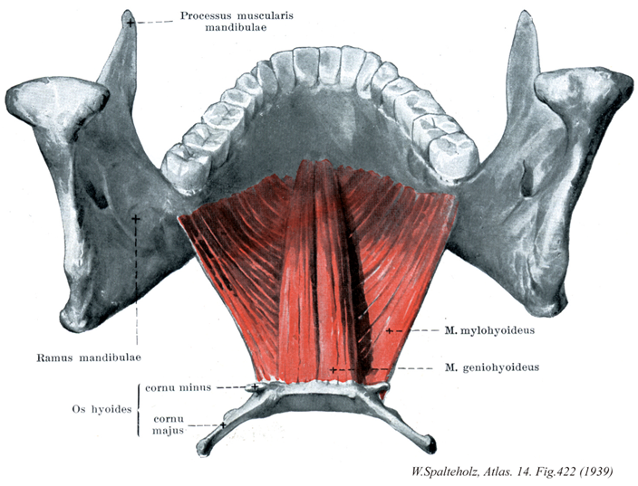 →(顎舌骨筋は両側性に下顎骨の内面側から舌骨筋線の部分で起始する。左右両筋部は後方で収斂して、正中縫線で合一して筋板を形成し、この筋板は舌骨体に付着し、かつ両側下顎骨半を連結する。両側顎舌骨筋は口底隔膜を形成する。)