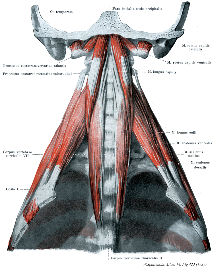 →(頭長筋と頚長筋はおうおうにして互いの境界が明瞭に定められない。この筋は縦あるいは斜めに走る線維束を持つ複合羽状構造をもつ。筋腹には通常不完全ながら腱画が挿入されている。頭長筋の起始は第3,4,5,6頚椎横突起の前結節。停止は後頭骨底部の下面。機能として頚椎と糖を屈曲しかつ回旋の補助をする。神経支配は第1,2,3,4頚神経の筋枝。動脈は下甲状腺動脈の上行頚枝、上行咽頭動脈の前脛骨枝、脛骨動脈の筋枝から受ける。)