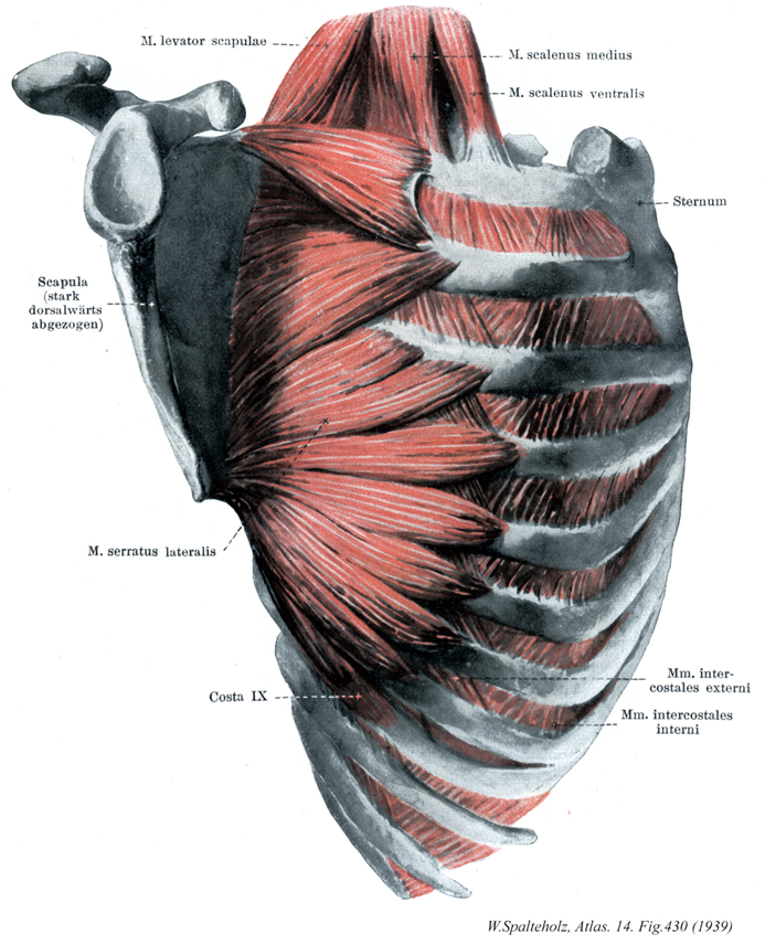 →(前鋸筋は、起始が二次的に体幹の腹外側に移動したものである。このことは人の個体発生でも示される。前鋸筋の起始は上部8ないし9本の肋骨の外側面。停止は肩甲骨椎骨縁(内側縁の肋骨面)。機能として肩甲骨の外転、肩甲骨を固定した場合は肋骨を引き上げる。神経支配は長胸神経。動脈は外側胸動脈から受ける。)