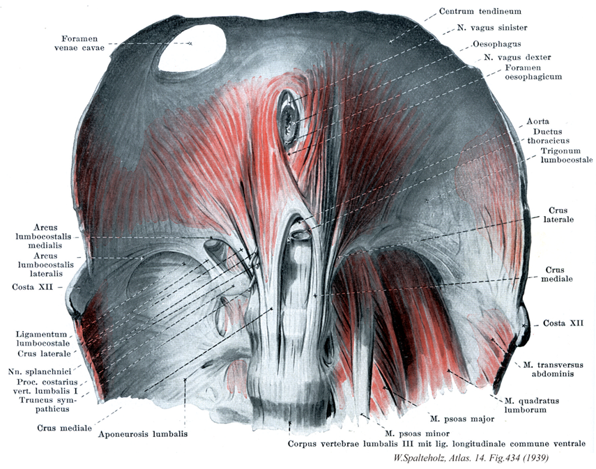 →(横隔膜は胸腔と腹腔との境を作る膜状筋で、胸郭下口の周りから起こる。この起始部を腰椎部、肋骨部、胸骨部の3部に分ける。これらの部から出る筋束は全体として円蓋のように胸腔に盛り上がって集まり、中央部の腱膜につく。これを腱中心という。横隔膜の上面は胸内筋膜および胸膜と心膜、下面は横隔膜筋膜(横筋筋膜の一部)および腹膜(肝臓その他の臓器が接する部分を除いて)被われる。ドーム状の横隔膜は胸腔の床および腹腔の天井となる。閉鎖した筋腱様のしきりは哺乳類の特質である。横隔膜は最重要な呼吸筋である。筋素材は系統発生的に第3~5の頚部筋節から由来し、頚神経叢からの横隔神経(C4(3,5))に支配される。筋性横隔膜は腰椎部、肋骨部、胸骨部から形成される。)