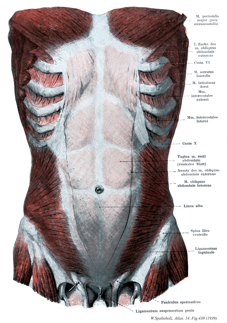 →(内腹斜筋の起始は腰筋膜、腸骨稜の中間線の前部2/3、鼡径靱帯の外側2/3。停止は上部線維は最下位の3本の肋骨の軟骨へ着き、残りは第10肋骨へ着き、残りは第10肋軟骨から恥骨までわたっている腱膜に扇形にひろがって付着し腹部の中央線で白線を形成している。機能として腹部の圧縮、腹部の内臓を保護する、強い呼気の時活動する。神経支配は下部6本の胸神経と上部2本の腰神経の前枝、腸骨下腹神経と腸骨鼡径神経からの枝。動脈は上および下腹壁動脈と深腸骨回旋動脈の筋枝から受ける。この内腹斜筋の腱膜の線維は、白線において外腹斜筋の腱膜の線維と交織し、反対側の外腹斜筋の腱膜に連続する。こうして腹壁を斜めに取り巻く一続きの筋腱性の帯が形成され両側の2つの斜筋は1つの運動単位として結ばれることになる。内腹斜筋の筋線維束は、急角度で上昇し、筋性に第(9)10~12肋軟骨の下縁に停止する。これらの筋束は、頭側では明確な境界なしに内肋間筋に連続している。それより腹側で起こる内腹斜筋の筋線維束、腹側になればなるほど上に向かう角度がゆるやかになり、上前腸骨棘から起こる筋線維束はほぼ水平、鼡径靭帯から起こる筋線維束は斜め下方へ進むようになる。尾側部では、内腹斜筋を腹横筋から区別することが非常にむずかしい。2つの筋を頭側で隔てている結合組織層(その中を神経が走る)は、上前腸骨棘の高さで終わり、腸骨下腹神経の前皮枝と腸骨鼡径神経は、内腹斜筋の腹側面を走るようになる。)