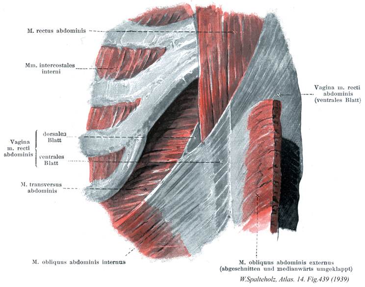 →(腹横筋の起始は下位6本の肋骨の肋軟骨内面、腰筋膜の内層、腸骨稜の内唇の前2/3、鼡径靱帯の外方1/3。停止は腱膜鞘につつまれて両腹斜筋とともに白線の中へ。機能としては腹部の圧縮、腹部内臓の保護、強い呼気時に働く。神経支配は下位6本の肋間神経の前枝、腸骨下腹神経と腸骨鼡径神経。動脈は深腸骨回旋動脈、下腹壁動脈。腹横筋は胸横筋の尾側に隣接している。この筋は、第7(6,5)から第12肋軟骨の内面、腰椎の肋骨突起(胸腰筋膜の深葉を介して)、腸骨稜の内唇および鼡径靱帯の外側部から起こる。この筋線維は、ほぼ水平に(腹直筋に直角)に走り、半月状の外側に凸の線、半月線を越えて腱膜となる。腹横筋の腱膜は腹直筋鞘の形成に関わる。その腱膜の線維は、白線で内腹斜筋の腱膜の線維と連結している。)