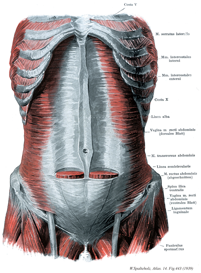 →(腹横筋の起始は下位6本の肋骨の肋軟骨内面、腰筋膜の内層、腸骨稜の内唇の前2/3、鼡径靱帯の外方1/3。停止は腱膜鞘につつまれて両腹斜筋とともに白線の中へ。機能としては腹部の圧縮、腹部内臓の保護、強い呼気時に働く。神経支配は下位6本の肋間神経の前枝、腸骨下腹神経と腸骨鼡径神経。動脈は深腸骨回旋動脈、下腹壁動脈。腹横筋は胸横筋の尾側に隣接している。この筋は、第7(6,5)から第12肋軟骨の内面、腰椎の肋骨突起(胸腰筋膜の深葉を介して)、腸骨稜の内唇および鼡径靱帯の外側部から起こる。この筋線維は、ほぼ水平に(腹直筋に直角)に走り、半月状の外側に凸の線、半月線を越えて腱膜となる。腹横筋の腱膜は腹直筋鞘の形成に関わる。その腱膜の線維は、白線で内腹斜筋の腱膜の線維と連結している。)