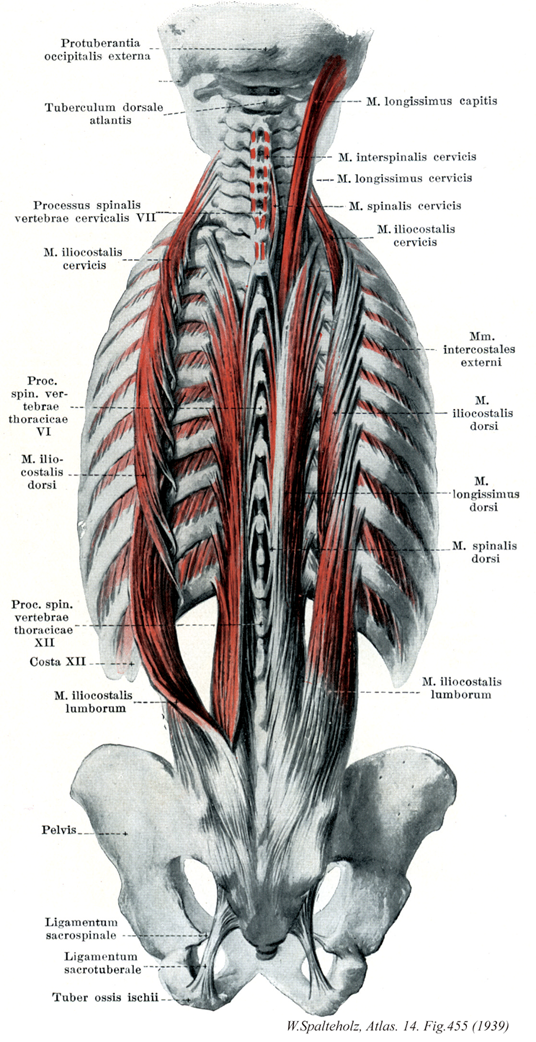 →(胸最長筋は腰部腸肋筋と一緒に強大な腱板でもって腰椎棘突起、仙骨、腸骨後縁、後仙腸靱帯から起始する。いわゆる副突起は下位6個の胸椎横突起と上位2個の腰椎の乳頭突起に由来する。胸部では内側への停止は全胸椎の横突起であり、外側への停止は第2~12肋骨の助骨角の内側である。脊柱腰部では、筋束は上記相同の部分へ、内側の筋束は第1~4腰椎の副突起(L5の乳頭突起と同じように)へ、そして外側の停止は第1~4腰椎肋骨突起(胸腰筋膜の深層と同じように)至る。)