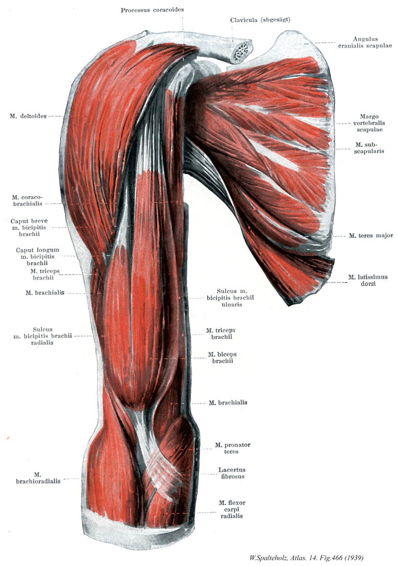 →(三角筋は肩から上腕の上部にかけての丸みをつくる強大な筋。厚い筋性の被いで、上腕骨近位端を上、前、横および後から包んでいる。これは肩の弯曲を形どっている。しかしそれは筋自体によるものではなく、骨の形、特に大結節によっている。広げると、この筋は逆さにしたギリシャ文字のデルタに似ている。なぜなら肩関節における起始は非常に広がっており、上腕骨における停止は大変狭いからである。三角筋は鎖骨の外側1/3、肩峰および肩甲棘から起こる。肩峰部は複合羽状である(多数の線維-大きな生理的断面)、筋の内表面にあり三角筋粗面に停止しする腱に向かって筋線維の太い束が、集まっている。作用として上腕を外転する。しかし、三角筋は上腕を体幹に沿って下垂している状態から直ちに外転することはできない(三角筋の筋線維の走行が上腕骨の長軸に平行であるため、はじめは上腕を上方に引き上げるにすぎない)。したがって、上腕を下垂した位置から外転するためには、最初に棘上筋によって外転を起動しなければならない。)