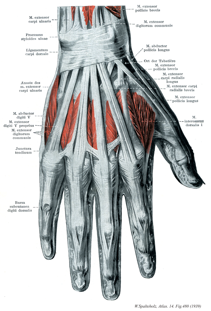 →([総]指伸筋は、尺側手根伸筋の橈側で前腕の中央に位置している。筋は肘関節の外側靱帯束、前腕筋膜および、この筋を短橈側手根伸筋から分けている結合組織中隔から起きる。筋は第2~第5指の指背腱膜に停止する。[総]指伸筋の4つの腱は同じ層に位置し、伸筋支帯の下の第4腱区画をともに通過する。中手骨領域で、腱は横走靱帯(腱間結合)で互いに結合し、指背で指背腱膜を形成する。腱の中央索は中節骨底に終わり、中節関節を越えた両側の腱索は中節骨の背側で合して第2~第5末節骨底に付く。)