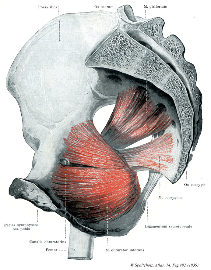 492_06【Piriformis muscle梨状筋 Musculus piriformis】 o: Anterior surface of sacrum, i: Greater trochanter, medial aspect of the apex. Abduction, extension, and lateral rotation at the hip joint. 1: Sacral plexus. →(梨状筋は骨盤の後側の深層にある回旋筋で仙骨の骨盤筋膜(前仙骨孔およびそれらの外側の)と仙腸関節の関節包から、大坐骨切痕上縁に由来する線維束とともに、起始する。大坐骨孔を通過して、同孔を梨状筋上孔と下孔に分け、大腿筋の深層を骨盤外側をおおって走り、大転子先端の内側に至る。広い起始に始まり、梨状筋は次第に収束して細い停止腱となる。股関節と停止腱は滑液包により隔てられる。坐骨神経の梨状筋枝から支配を受け、股関節の外転、伸展および外旋を行う。)