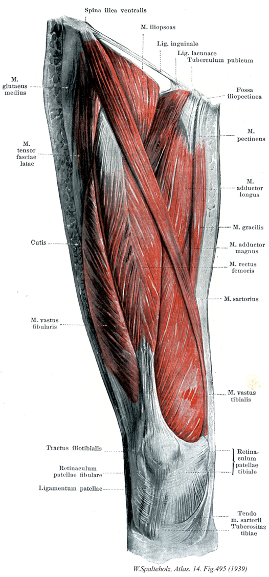 →(大腿直筋は大腿前側の筋で大腿四頭筋の中央浅層にある。羽状筋の大腿直筋は下前腸骨棘から起こる直頭と寛骨臼上縁や股関節から起こる反転頭からなる。起始腱中心部からの線維は膝蓋骨の上縁に終わるが、膝蓋骨前面を通って膝蓋靱帯となる。両側方の線維は膝蓋骨の両側へ放散し、膝蓋支帯になる。)