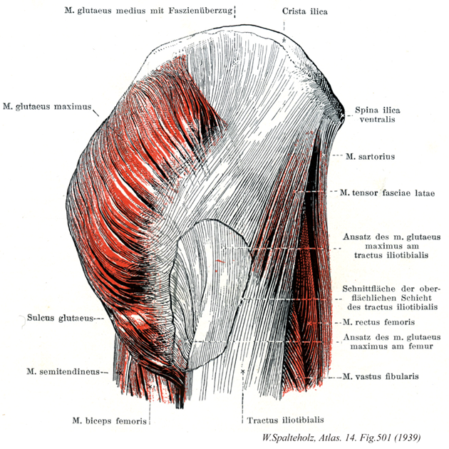 →(大臀筋は大腿を伸展する主力筋で、とくに歩行の際重要である。中臀筋や小臀筋(小さな臀部の筋群)と同様、大きな臀部の筋である大臀筋も発生的には伸筋群である。仙骨と尾骨の辺縁、後臀筋線より後方の腸骨稜、胸腰筋膜、そして仙結節靭帯などから起始する。その厚い筋線維束は斜め下方へ走り、広い停止腱となる。その停止域は近位では大腿筋膜、腸脛靱帯に放散する。また、臀筋粗面よりも遠位で外側筋間中隔より上の粗線外側唇にも停止する。坐骨包坐骨結節と大臀筋下面の筋膜との間にある。慢性的刺激の結果として(機織工結節、抗夫結節)、臀部に敷物なしに座り仕事をする人々では同包に炎症が起こり、後大腿皮神経を圧迫する。大腿筋の停止腱は転子包によって大転子と離される。臀筋粗面では、大腿筋はふつう他の臀筋との間にあるいくつかの筋間包の上を滑走する。立位では大臀筋下部が坐骨結節をおおう。大腿を屈すると大臀筋下部は頭側に移動する。このため座位では坐骨結節は皮下脂肪上に位置し、皮膚を通して容易に触れる。臀溝はほぼ水平に走り、大臀筋収縮時には深くなるが、大臀筋の下縁をあらわしているわけではなく、同筋走行に対して鋭角的に交わる。)