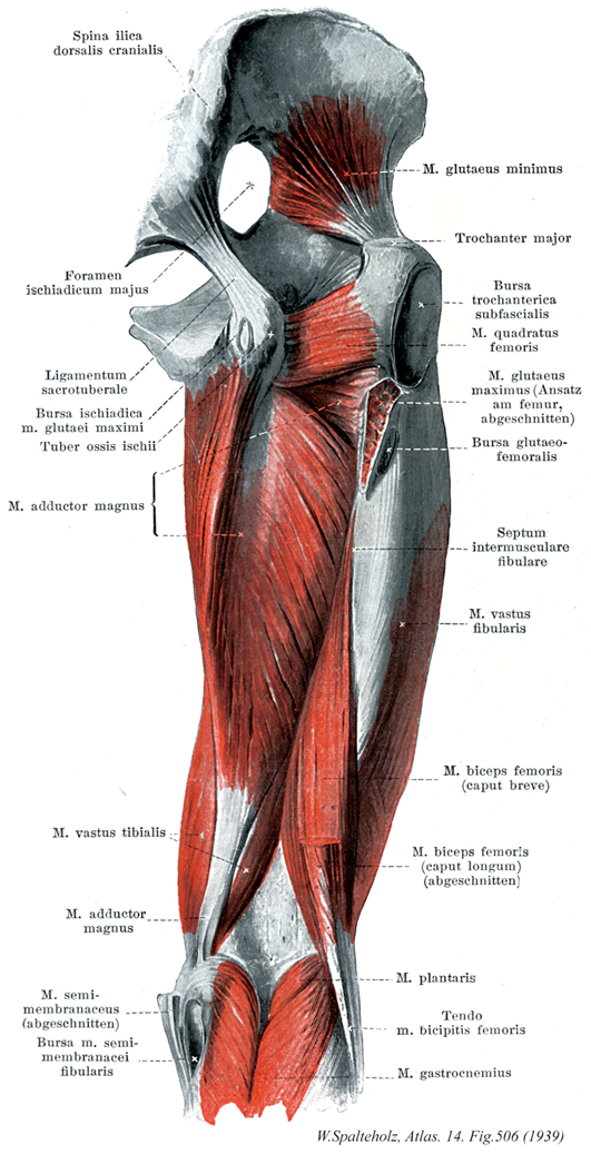 →(大臀筋は大腿を伸展する主力筋で、とくに歩行の際重要である。中臀筋や小臀筋(小さな臀部の筋群)と同様、大きな臀部の筋である大臀筋も発生的には伸筋群である。仙骨と尾骨の辺縁、後臀筋線より後方の腸骨稜、胸腰筋膜、そして仙結節靭帯などから起始する。その厚い筋線維束は斜め下方へ走り、広い停止腱となる。その停止域は近位では大腿筋膜、腸脛靱帯に放散する。また、臀筋粗面よりも遠位で外側筋間中隔より上の粗線外側唇にも停止する。坐骨包坐骨結節と大臀筋下面の筋膜との間にある。慢性的刺激の結果として(機織工結節、抗夫結節)、臀部に敷物なしに座り仕事をする人々では同包に炎症が起こり、後大腿皮神経を圧迫する。大腿筋の停止腱は転子包によって大転子と離される。臀筋粗面では、大腿筋はふつう他の臀筋との間にあるいくつかの筋間包の上を滑走する。立位では大臀筋下部が坐骨結節をおおう。大腿を屈すると大臀筋下部は頭側に移動する。このため座位では坐骨結節は皮下脂肪上に位置し、皮膚を通して容易に触れる。臀溝はほぼ水平に走り、大臀筋収縮時には深くなるが、大臀筋の下縁をあらわしているわけではなく、同筋走行に対して鋭角的に交わる。)