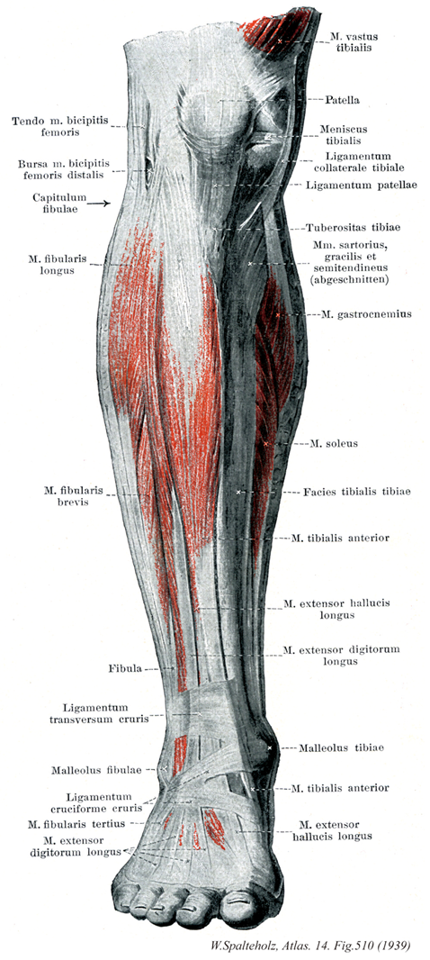 - 510_24【Tibialis anterior muscle前脛骨筋 Musculus tibialis anterior】 o:Lateral surface of tibia, interosseous membrane, deep fascia of leg. i: Medial aspects of medial cuneiform and first metatarsal. Dorsiflexion and supination of foot. I: Deep fibular nerve.