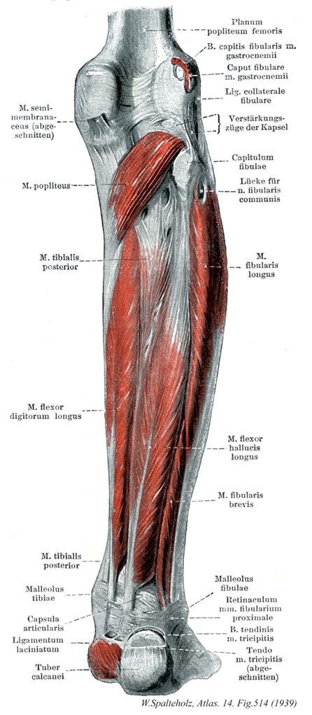 →(後脛骨筋は骨間膜の広い領域から起こる。狭い辺縁部は腓骨と脛骨の近位部に起こり、浅い線維束は浅深の屈筋間にある結合組織から起こる。後脛骨筋の腱は内果上方で長趾屈筋の腱の下を横切り(下腿腱交叉)、その主束は舟状骨粗面につき、その外側束は(しばしば)すべての遠位足根骨と第2~4中足骨底の足底面に付く。内果溝で後脛骨筋の腱は腱鞘に包まれ、内果下方では屈筋支帯におおわれている。深屈筋群へ脛骨神経の筋枝の中で後脛骨筋への枝はほかの枝よりもずっと近位、ヒラメ筋腱弓のレベルで出る。母趾とそのほかの趾への長屈筋群に対する近位の枝は下腿中位1/3へうつるレベルで脛骨神経から分かれる。脛骨神経からの筋枝は普通下腿遠位1/2からも分かれる。後脛骨筋は脛骨神経の支配を受ける。この筋の収縮により距腿関節における足の底屈、距骨下関節および横足根関節による足の内反が得られる。この筋は内層の縦足弓を維持するうえにも重要である。この筋の収縮が足底で数個の骨を互いに引き寄せるうえに役立つことにも注意すべきである。)