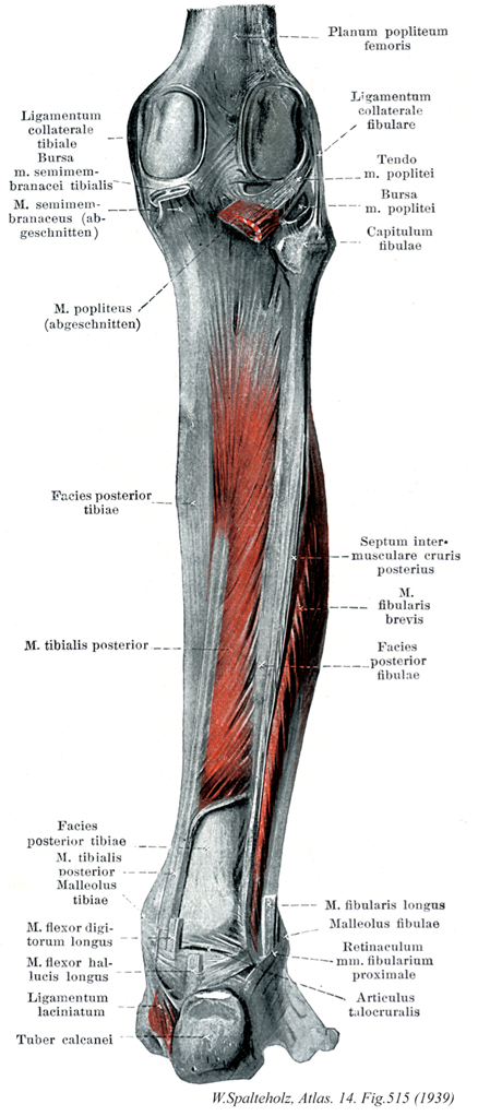 →(後脛骨筋は骨間膜の広い領域から起こる。狭い辺縁部は腓骨と脛骨の近位部に起こり、浅い線維束は浅深の屈筋間にある結合組織から起こる。後脛骨筋の腱は内果上方で長趾屈筋の腱の下を横切り(下腿腱交叉)、その主束は舟状骨粗面につき、その外側束は(しばしば)すべての遠位足根骨と第2~4中足骨底の足底面に付く。内果溝で後脛骨筋の腱は腱鞘に包まれ、内果下方では屈筋支帯におおわれている。深屈筋群へ脛骨神経の筋枝の中で後脛骨筋への枝はほかの枝よりもずっと近位、ヒラメ筋腱弓のレベルで出る。母趾とそのほかの趾への長屈筋群に対する近位の枝は下腿中位1/3へうつるレベルで脛骨神経から分かれる。脛骨神経からの筋枝は普通下腿遠位1/2からも分かれる。後脛骨筋は脛骨神経の支配を受ける。この筋の収縮により距腿関節における足の底屈、距骨下関節および横足根関節による足の内反が得られる。この筋は内層の縦足弓を維持するうえにも重要である。この筋の収縮が足底で数個の骨を互いに引き寄せるうえに役立つことにも注意すべきである。)