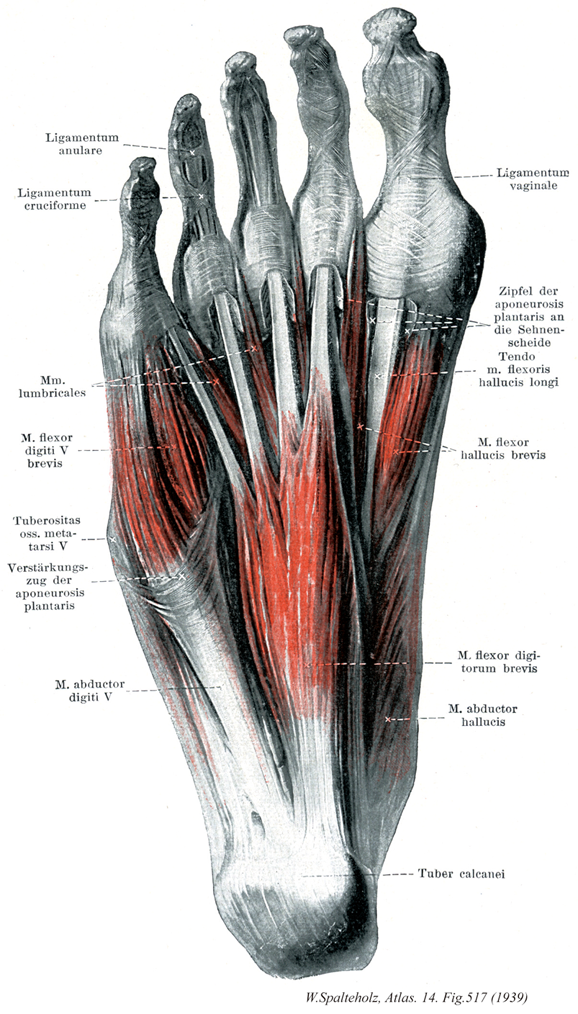 - 517_11【Flexor digitorum brevis muscle短趾屈筋;短指屈筋(足の) Musculus flexor digitorum brevis】 o: Calcaneal tuberosity and plantar aponeurosis. i: Its divided tendons insert onto the middle phalanges of the second through fifth toes. Flexion of metatarsophalangeal and middle phalangeal joints, support of longitudinal arch of foot. I: Medial plantar nerve.