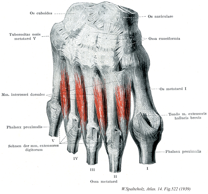 →(4つの背側骨間筋は2頭をもってすべての中足骨対向面および長足底靱帯から起こる。背側骨間筋も基節骨底に停止し、第2趾がこれらの筋の対称線となる。腱線維が指背腱膜へ放散することはほとんどない。背側骨間筋の停止腱の一部は第2~4趾の趾背腱膜展開部にも伸びる。外側足底神経の趾背を受けるこれらの筋の収縮により、第2趾を中心として散開するような各趾の外転、第2~4趾における中足趾節関節の屈曲と趾節間関節の伸展が得られる。個々の背側骨間筋が隣接する2本の中足骨より起始する関係上、この筋の収縮は中足骨を寄せ集めて前足部の構造の安定性を高める上にも役立つ。)