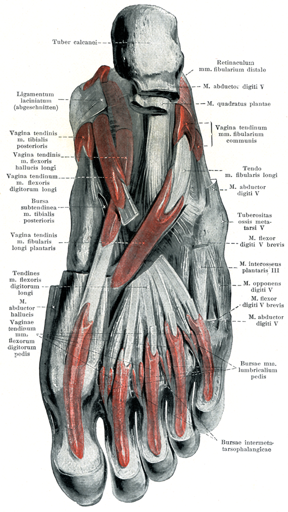 →(長腓骨筋の足底腱鞘は足底部における長腓骨筋腱の周りにある。)