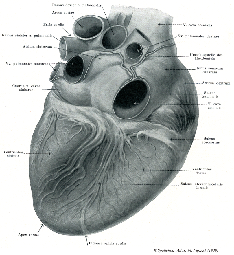 531_03【Base of heart心底 Basis cordis】 Broad aspect of the heart facing dorsally and to the right, located opposite to the apex of the nearly conical heart, it is mainly formed by the posterior wall of the left atrium. The pulmonary arteries and vasa privata arise and open here. →(心底はほぼ円錐状の心臓の上側、心尖の反対側の広い面。主に左心房と右心房の一部とできる。横隔面からは冠状溝で境される。)