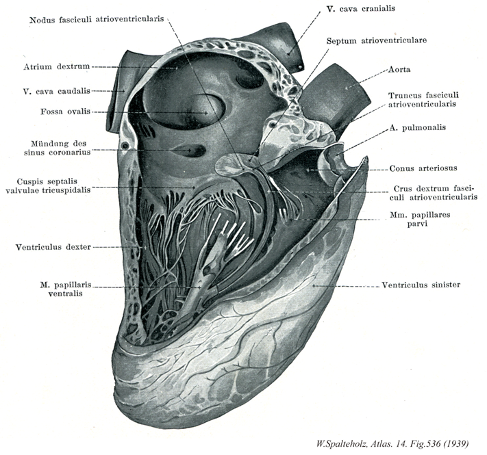 536_01Aschoff-Tawara node; Tawara, Node of【Atrioventricular node; Tahara node房室結節(田原結節) Nodus atrioventricularis】 Specialized muscle tissue in the interatrial septum below the fossa ovalis and in front of the opening of coronary sinus. It transmits the myogenically conducted impulse received from the sinu-atrial node after a period of latency to the ventricles via the bundle of His (and right and left bundles of His). If sinu-atrial node function is disrupted, it ca. act as a secondary center for generation of cardiac impulses. →(田原の結節ともよばれてる。房室結節は心房中隔で、卵円窩の下方、冠状静脈洞口の前方にある特殊心筋組織の小塊。洞房結節から筋性に伝搬された刺激を、一定の潜伏時間をおいてHis束およびその脚を通して心室に伝える。洞房結節が機能的に脱落した際には、房室結節は二次的な刺激形成中枢として心拍動の維持にあたることができる。九州大学の田原順(1873-1938)が1901年、東京帝国大学を卒業、1903年ドイツに留学。アールブルグ大学でアショッフの元で研究中、心筋の房室間の刺激伝導路系を発見。その起始部の小筋塊を田原結節と命名("Das Reizleitungssystem des Saugetierherzens", 1906)。帰国後、九州帝国大学教授となる。世界に通じる数少ない日本人の名前の一つである。)