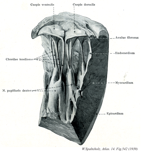 542_02【Chordae tendineae of heart; Tendinous cords of heart腱索(心臓の) Chordae tendineae cordis】 Tendinous cords passing between the papillary muscles and atrioventicular valves. →(心臓の腱索は乳頭筋と房室弁(僧帽弁および三尖弁)をむすぶ腱。)
