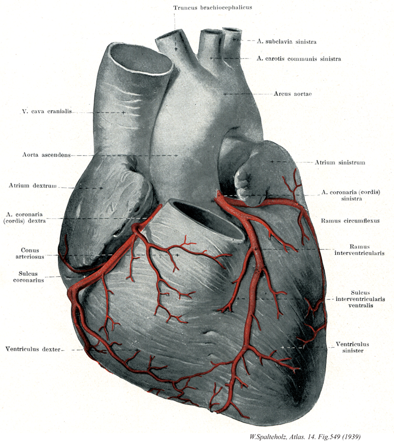 549_13【Left coronary artery左冠状動脈 Arteria coronaria sinistra; Arteria coronaria cordis sinistra】 It arises near the left aortic sinus. →(左冠状動脈は右心耳と肺動脈との間から前面に現れて、前室間溝を大心臓静脈の主脈と共に下降する(前室間枝)。これから分かれるかなり大きい枝が冠状溝に沿って後面へ回り(回旋枝)、右冠状動脈の枝と吻合する。この回旋枝からは、左辺縁枝が下方に出る。)
