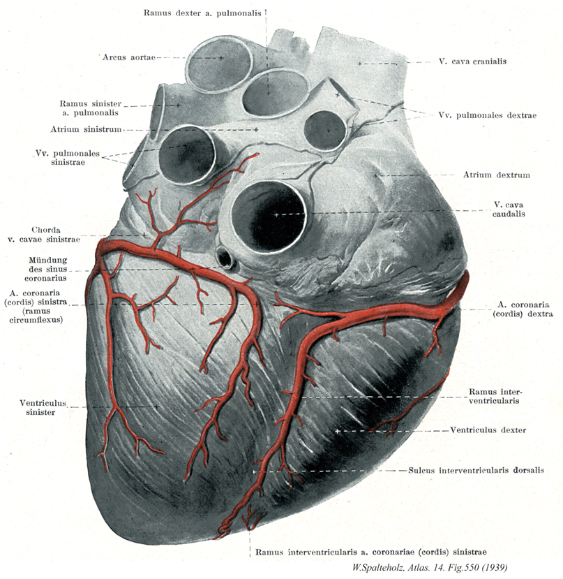 →(左冠状動脈は右心耳と肺動脈との間から前面に現れて、前室間溝を大心臓静脈の主脈と共に下降する(前室間枝)。これから分かれるかなり大きい枝が冠状溝に沿って後面へ回り(回旋枝)、右冠状動脈の枝と吻合する。この回旋枝からは、左辺縁枝が下方に出る。)