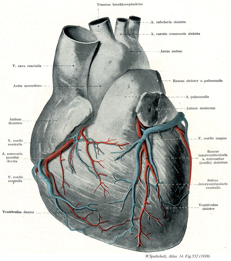 552_04【Anterior vein(s) of right ventricle; Anterior cardiac veins前心臓静脈;前心静脈;前右心室静脈 Venae ventriculi dextri anterior(es); Venae cardiacae anteriores; Venae cordis anteriores】 One to three smaller veins on the right anterior wall. They open either into the small cardiac vein or directly into the right atrium. →(前心臓静脈は右心室の前壁にある1~3本の小静脈で、直接に右心房に開口する。)