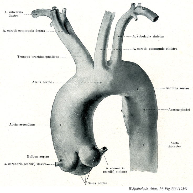 →(バルサルバ洞とも呼ばれる。上行大動脈は基部に左・右・後3つの大動脈弓をもち、この内腔を大動脈洞という。左右の大動脈洞から冠状動脈がでる。イタリアの解剖学者Antonio Maria Valsalva (1666-1723)の名を冠する。)