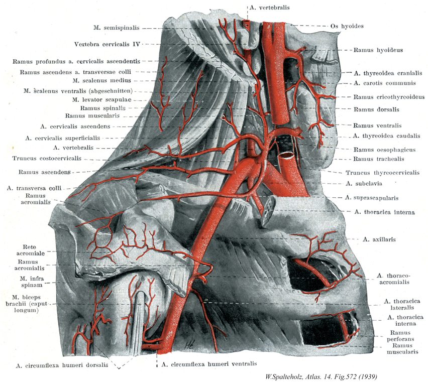 - 572_31【Thyrocervical trunk甲状頚動脈 Truncus thyrocervicalis】 Varying common trunk of the inferior thyroid artery, transverse cervical artery, and suprascapular artery.