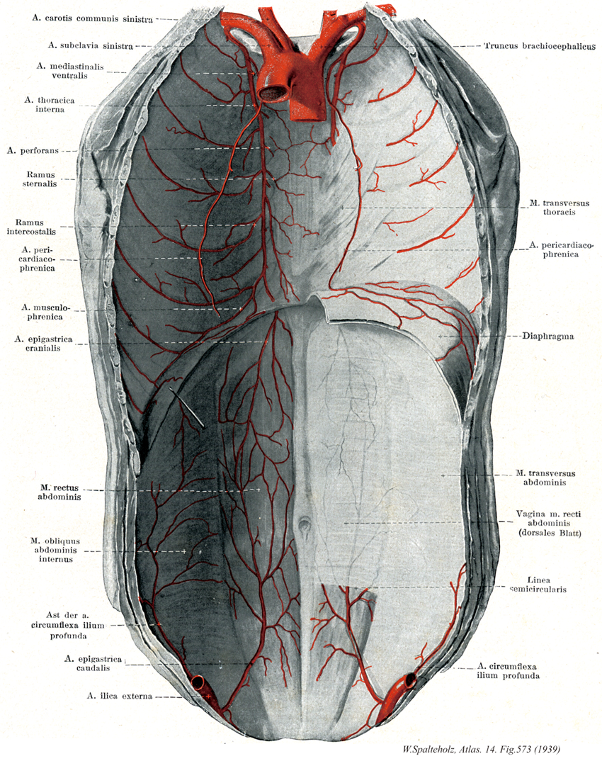→(内胸動脈は胸骨縁に沿い前胸壁内面を下行し、横隔膜前端を貫いて上腹壁動脈に移行し、腹直筋内で下腹壁動脈と吻合して、前正中線に沿う縦走動脈路を形成する。異常の経過からして縦隔と前胸壁に分布するのに適している。縦隔への枝としては、縦隔枝、胸腺枝、気管支枝さらに横隔神経に伴走する心膜横隔動脈がある。前胸壁への枝としては、胸骨枝、肋間隙を外側に走り肋間動脈と吻合する前肋間枝、肋間隙を貫き乳腺枝を分岐しうる貫通枝、ならびに横隔膜と胸壁下部に分布する筋横隔動脈などがある。なお側胸壁内面を下行する外側肋骨枝がまれに内胸動脈初部からおこることがある。)
