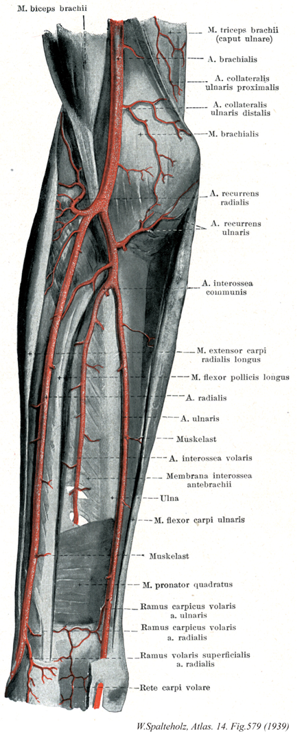 →(橈骨頚の高さで上腕動脈より分岐する動脈。前腕の橈側(外側)に沿って手根部まで下行し、次いで手根の外側(母指側)をまわって背側に達し、母指と第2指の中手骨間隙にある第1背側骨間筋の両頭の間を通って手掌に出る。前腕近位部では腕橈骨筋におおわれて走るが、遠位部では表在性になり、皮膚と前腕筋膜のおおわれるのみとなる。ことに手根部の近くではきわめて浅く、またその深層は橈骨下端に接するため、この部で脈拍を触れるのが容易である。この部は橈側手根筋のすぐ外側にあたる。手根から手背にいたる経路は、長母指外転筋、短母指伸筋、そして長母指伸筋のしたで、いわゆるtabatiereを通る。)