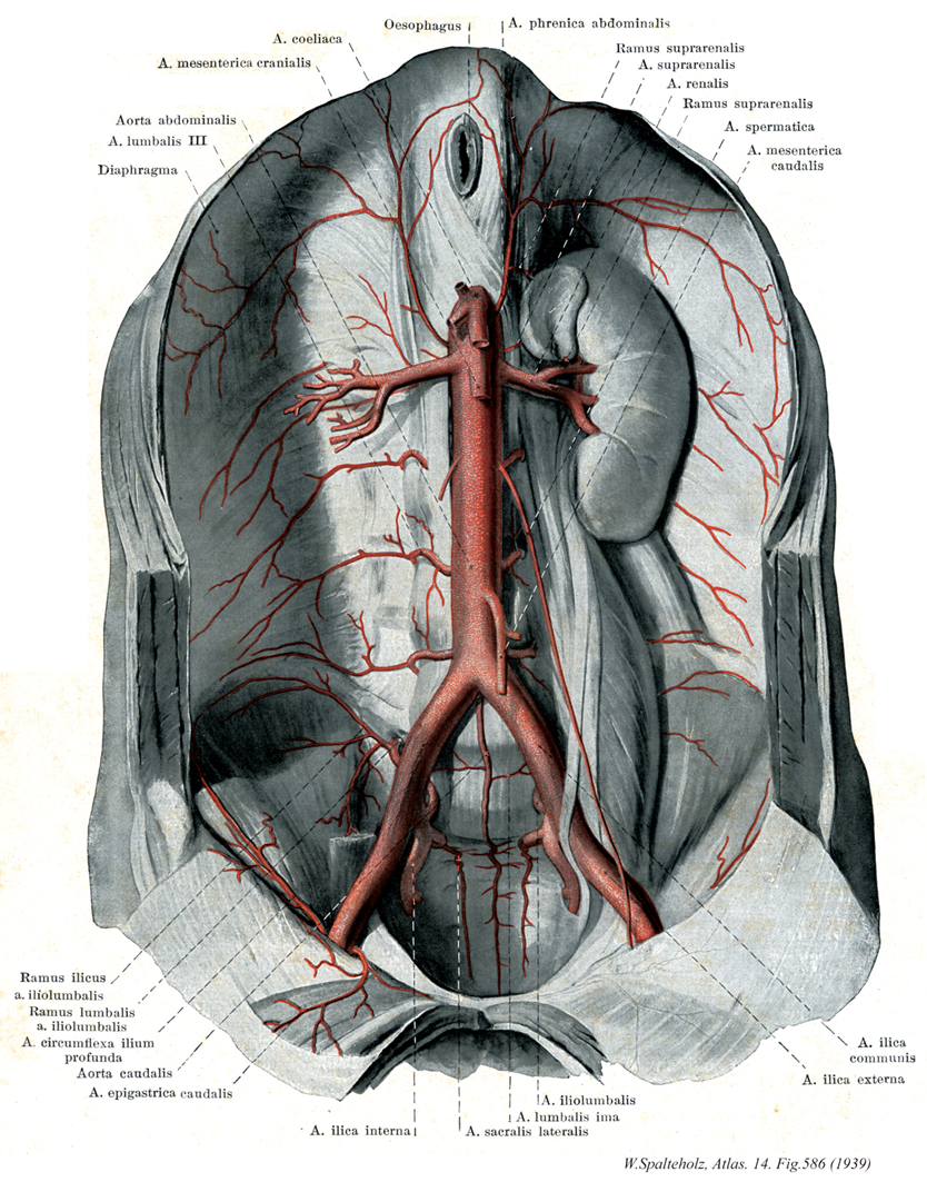→(腹大動脈は下行大動脈の腹腔内にある部分で、胸大動脈のつづきとして横隔膜大動脈裂孔にはじまり、脊柱前面を下行したあと、第4腰椎の高さで左右の総腸骨動脈を分岐して、細い正中仙骨動脈に移行する。胸大動脈とは反対に臓側枝が豊富でかつ協力である。)
