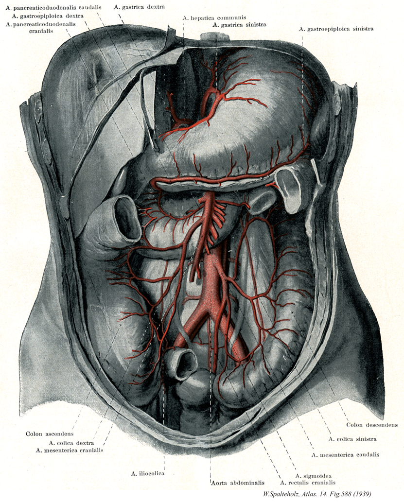→(上腸間膜動脈は腹腔動脈の約1~2cm下方(第1腰椎の高さ)で、腹大動脈の前側から起こる。動脈ははじめ膵臓の後ろを走り、膵臓の頭の左側に沿って前方に出て、十二指腸水平部の前面を下行し、小腸間膜のなかに入る。小腸間膜内で、左方にやや凸のカーブを描いて右腸骨窩に向かって下行し、下膵十二指腸動脈、空腸動脈、腸骨動脈、回結腸動脈、虫垂動脈、右結腸動脈、中結腸動脈に分布する。上膵十二指腸動脈、左結腸動脈と吻合する。)