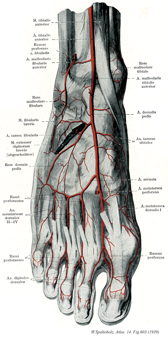 →(足の弓状動脈は外側足根動脈よりも少し遠位で分岐し、短趾伸筋に被われ中足骨の基部を外側方に弓状をなして走り、足の外側縁で外側足根動脈と吻合する。途中、これからは前方に向かって順次に第2,第3,第4背側中足動脈を分岐する。しかし弓状動脈が充分に発達して上記全ての背側中足動脈は足底の動脈から供給される。日本人では弓状動脈が10%以上の頻度で欠如し、また存在する場合でも細いことが多い。)